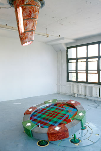 • Final Frontier, 2009 plexiglas, wood, plaster, nylon flocking, cast stone with decorative finish, stainless steel, monofilament, hardware, and light fixtures ceiling piece: 44" h x 32" x 32"; ground piece: 30" h x 75" x 60"