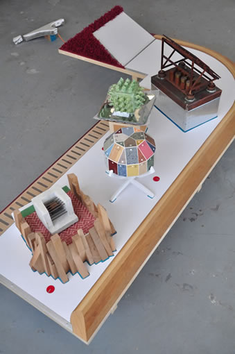 • The Origin of the Things (detail), 2009 plaster, wood, paper, plexiglas, cast stone, nylon flocking, glass, vinyl, decorative finish, and plastic action figures 46" h x 62" x 62"