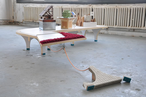 • Game and Match, 2009 wood, string, tape, painted rocks, hardware, and chair dimensions variable Collection of the Djerassi Residency Artists Program.