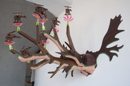 • Seeds of the Righteous (detail), 2012 Hardwood, nylon flocking, metal, plexiglas, wood veneer, and plaster 36"h x 42" x 48"