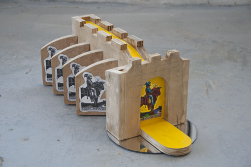 • True Knight of the Realm (for ek), 2012 Wood, paint, plexiglas, paper and tarot card 8"h x 21" x 10"
